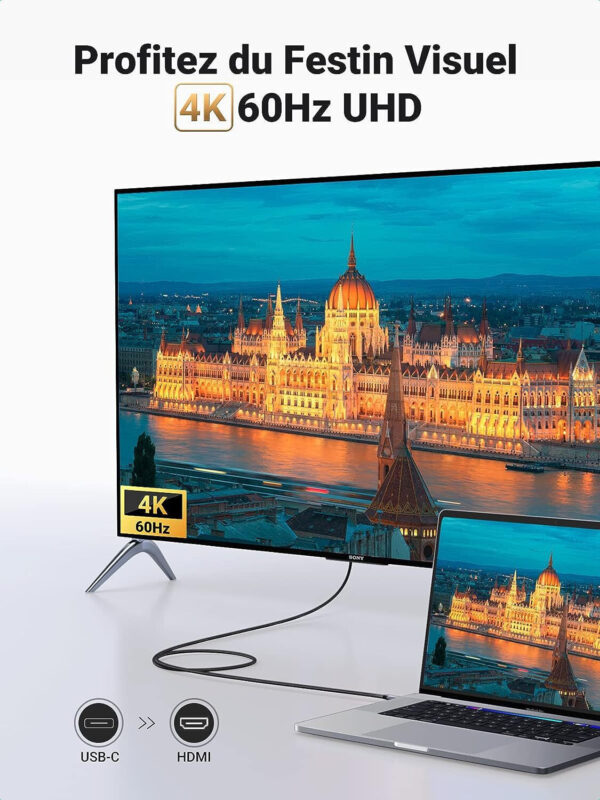 Connectez facilement votre laptop, tablette ou smartphone à votre TV ou moniteur avec le câble Ugreen USB-C vers HDMI. Profitez d’une qualité d’image exceptionnelle en 4K@60Hz, avec compatibilité 3D et rétrocompatibilité 1080P@144Hz. Ce câble offre une transmission stable grâce à son fil en cuivre étamé et un blindage multiple, tout en étant robuste et durable avec sa gaine en nylon tressé et ses connecteurs plaqués or 24K. Transformez votre appareil en un centre de divertissement ultime. Compatible avec de nombreux appareils, assurez-vous simplement que votre port USB C prend en charge la transmission vidéo.