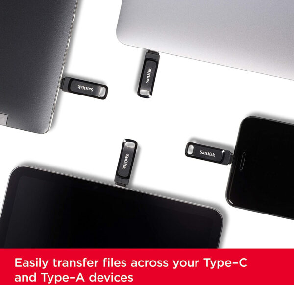Libérez votre créativité avec la clé double connectique USB Type-C™ Ultra Dual Drive 64Go de SanDisk. Transférez facilement vos fichiers entre vos appareils USB Type-C™ et Type-A grâce à cette clé 2-en-1. Libérez de l’espace sur votre smartphone et prenez davantage de photos. Sauvegardez automatiquement vos précieux souvenirs. Avec une vitesse de lecture allant jusqu’à 150 Mo/s, déplacez rapidement vos fichiers sur votre ordinateur. Protégez les connecteurs grâce au système pivotant. Pratique et portable, attachez-la à votre trousseau de clés. Compatible avec Windows et Mac OS.