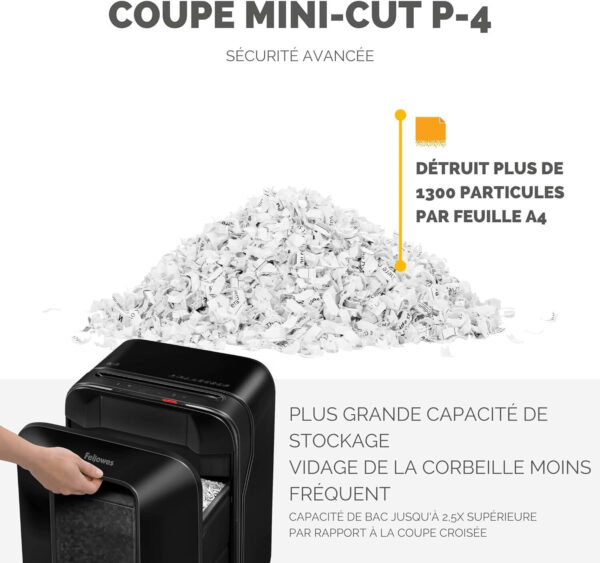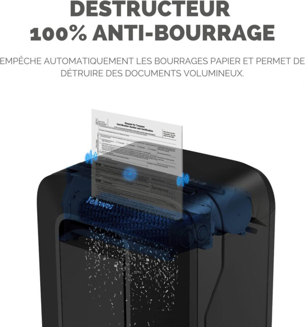 Optez pour le Fellowes Powershred® LX200, le destructeur de documents nouvelle génération pour une productivité optimale. Doté de la technologie Intellibar™, il prévient les interruptions grâce à des indicateurs de performance en temps réel. La technologie Safesense® garantit une sécurité maximale, tandis que le mode veille économise l’énergie. La coupe croisée Mini-Cut (4x12mm P-4) offre une destruction ultra-fine de 12 feuilles par passage, avec une corbeille extractible de 22 litres. Idéal pour les bureaux exigeants, ce destructeur assure une performance sans bourrage et une tranquillité d’esprit inégalée.