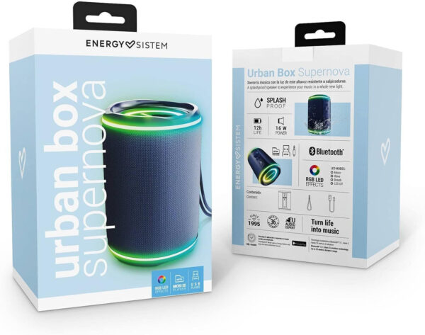 Profitez d’un son puissant et stylé avec l’enceinte portable Bluetooth Energy Sistem Urban Box Supernova – Bleu. Avec ses 16W, sa technologie Bluetooth 5.1 et TWS, connectez deux enceintes pour un son stéréo immersif. Illuminez vos soirées grâce aux LED RGB personnalisables et au design splashproof idéal pour l’extérieur. Autonomie jusqu’à 12 heures et compatibilité microSD/USB pour une lecture sans limite. Parfaite pour les amateurs de musique, cette enceinte combine style, robustesse et performances audio exceptionnelles.