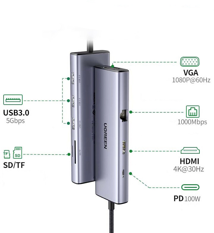 Transformez votre espace de travail avec le Hub USB-C Ugreen 9 en 1. Doté de ports polyvalents tels que HDMI 4K@30Hz, VGA, USB 3.0, Ethernet 1Gbps, et lecteur de cartes SD/TF, ce hub offre une connectivité étendue pour vos appareils. Le port de charge rapide PD 100W simplifie la gestion de l’alimentation, réduisant l’encombrement sur votre bureau. Transférez des fichiers rapidement grâce au port USB 3.0, et profitez d’une qualité d’image exceptionnelle avec le support 4K du port HDMI. Compact et robuste, ce hub Ugreen est l’accessoire idéal pour tous vos besoins de connectivité en déplacement.