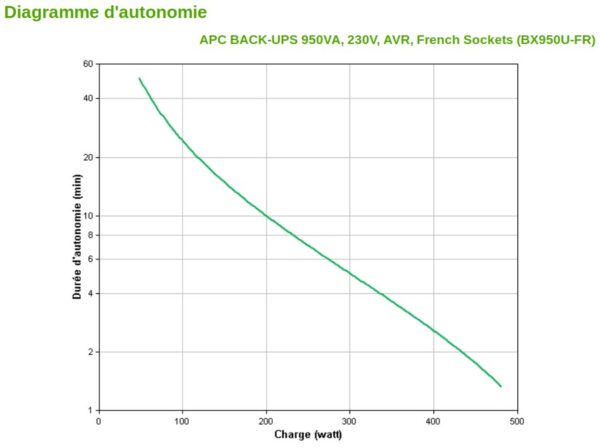 Autonomie: 50% de charge (240 Watts) : 7 minutes / 70% de charge (336 Watts) : 4 minutes