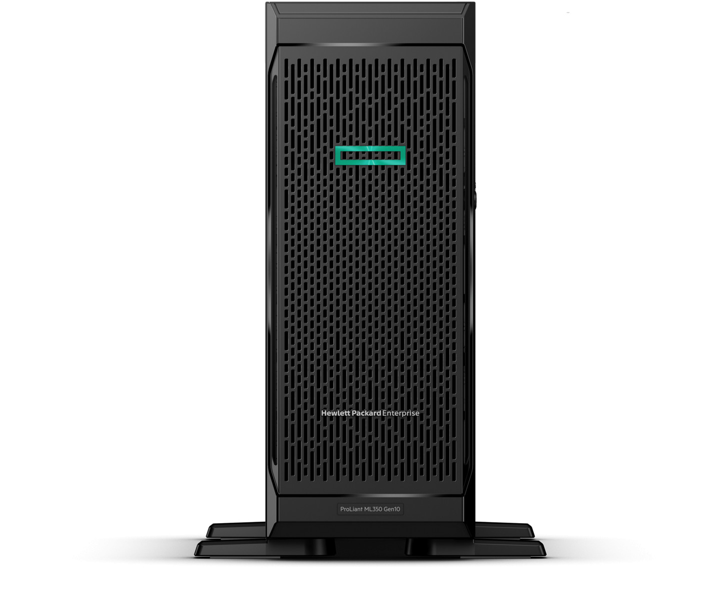 Serveur tour HPE ProLiant ML350 Gen10 avec un processeur Intel® Xeon® Silver 4210, 16 Go de mémoire, huit baies de lecteurs à petit facteur de forme et un module d’alimentation électrique de 800 W