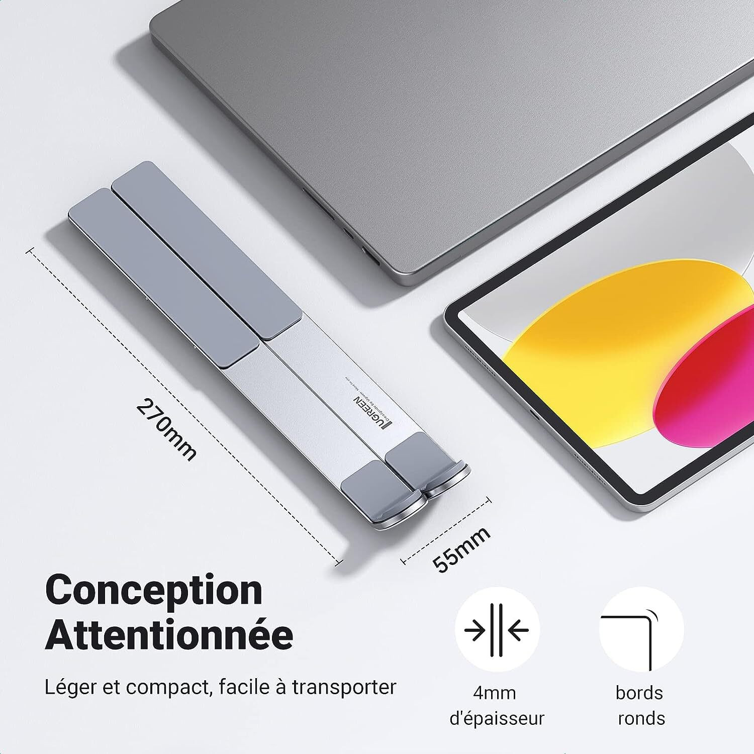 Optimisez votre espace de travail avec le Support Ordinateur Portable Ugreen en Aluminium. Avec ses 5 niveaux de hauteur réglables, il offre une ergonomie exceptionnelle pour votre ordinateur de 8 à 17,3 pouces, favorisant une position de frappe confortable et une meilleure visioconférence. Le matériau en aluminium et les tampons en silicone résistent aux rayures, garantissant la stabilité de votre appareil. De plus, sa conception creuse assure un refroidissement efficace pour une performance optimale. Compact et léger, il se range facilement dans le sac fourni, idéal pour une mobilité sans compromis. Commandez le vôtre aujourd’hui !