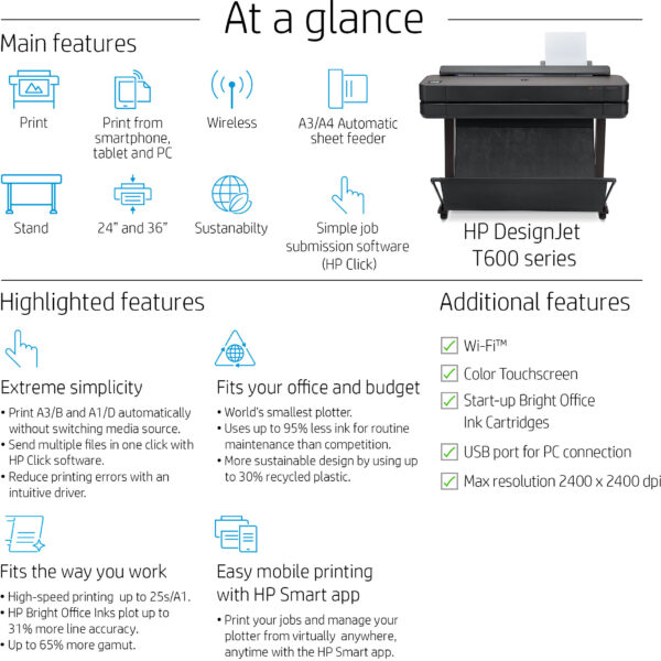 1 Les imprimantes HP série DesignJet T650 36 pouces sont jusqu’à 17 % plus petites par rapport aux alternatives concurrentes avec une taille et des fonctionnalités comparables en janvier 2020,. Les plus petits traceurs grand format au monde basés sur l’encombrement le plus compact.